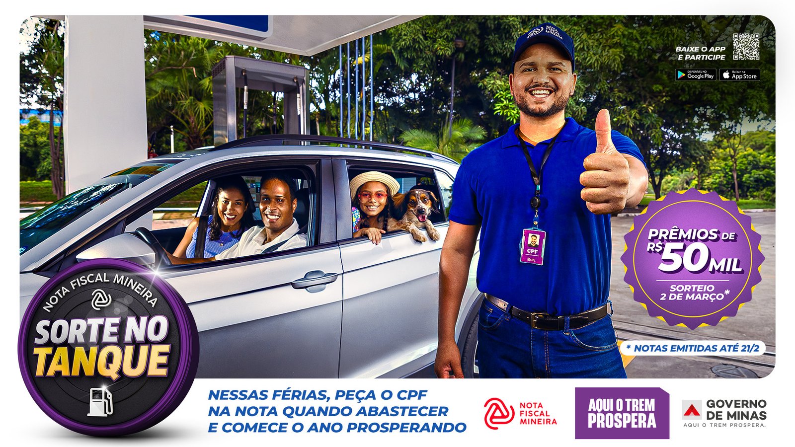 No dia 2 de março, a campanha Sorte no Tanque vai contemplar dois consumidores com R$ 50 mil cada e seis entidades socioassistenciais com R$ 10 mil cada, em uma ação de abrangência estadual. Para participar desse sorteio especial, concorrem os bilhetes gerados por Notas Fiscais de Consumidor eletrônicas (NFC-e) e Notas Fiscais eletrônicas (NF-e) emitidas entre 17 de janeiro e 21 de fevereiro de 2026, exclusivamente em vendas de combustíveis ou trocas de óleo em postos e estabelecimentos varejistas.